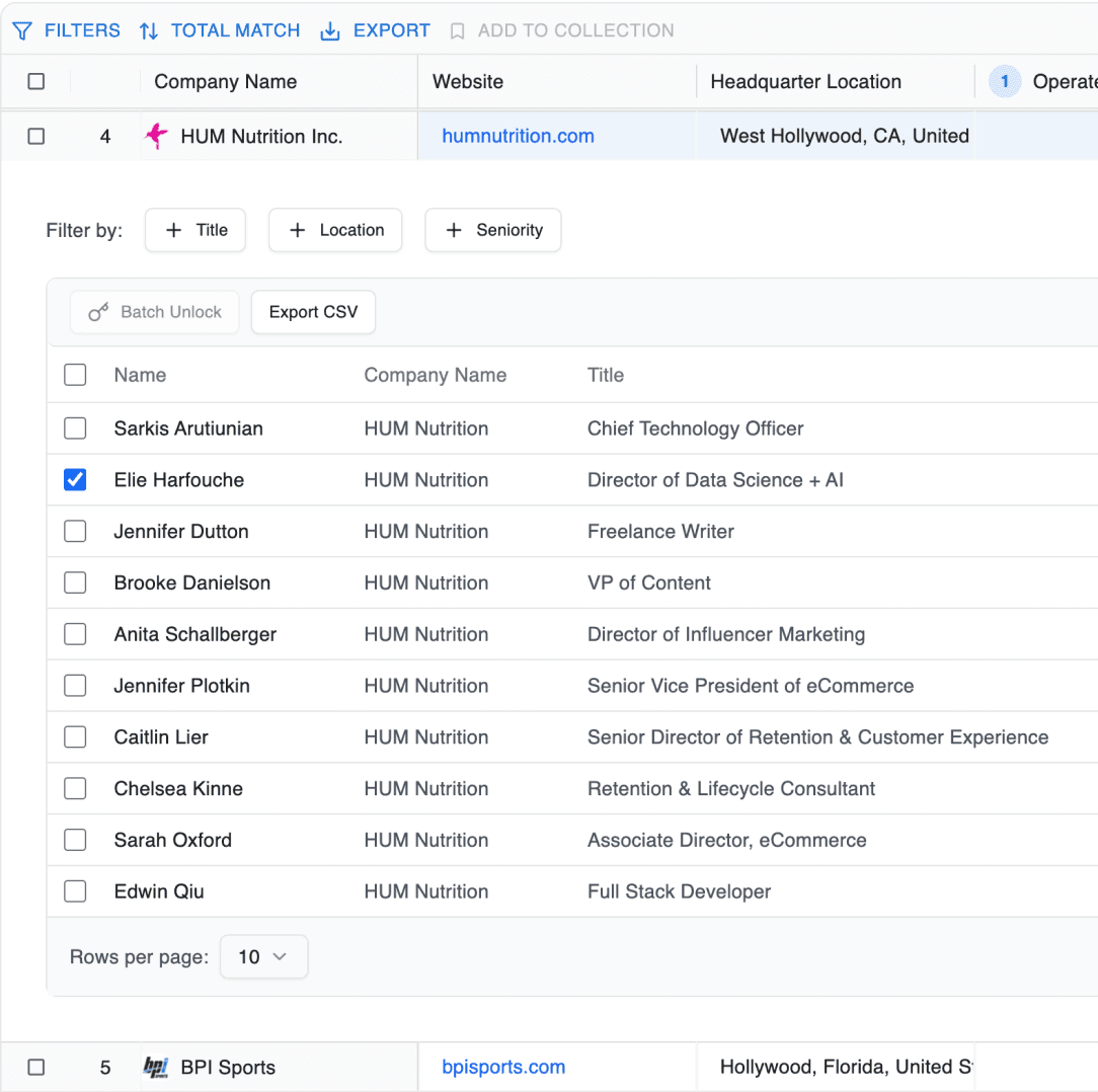 Unlock verified decision-makers for every company and export the data with one click.