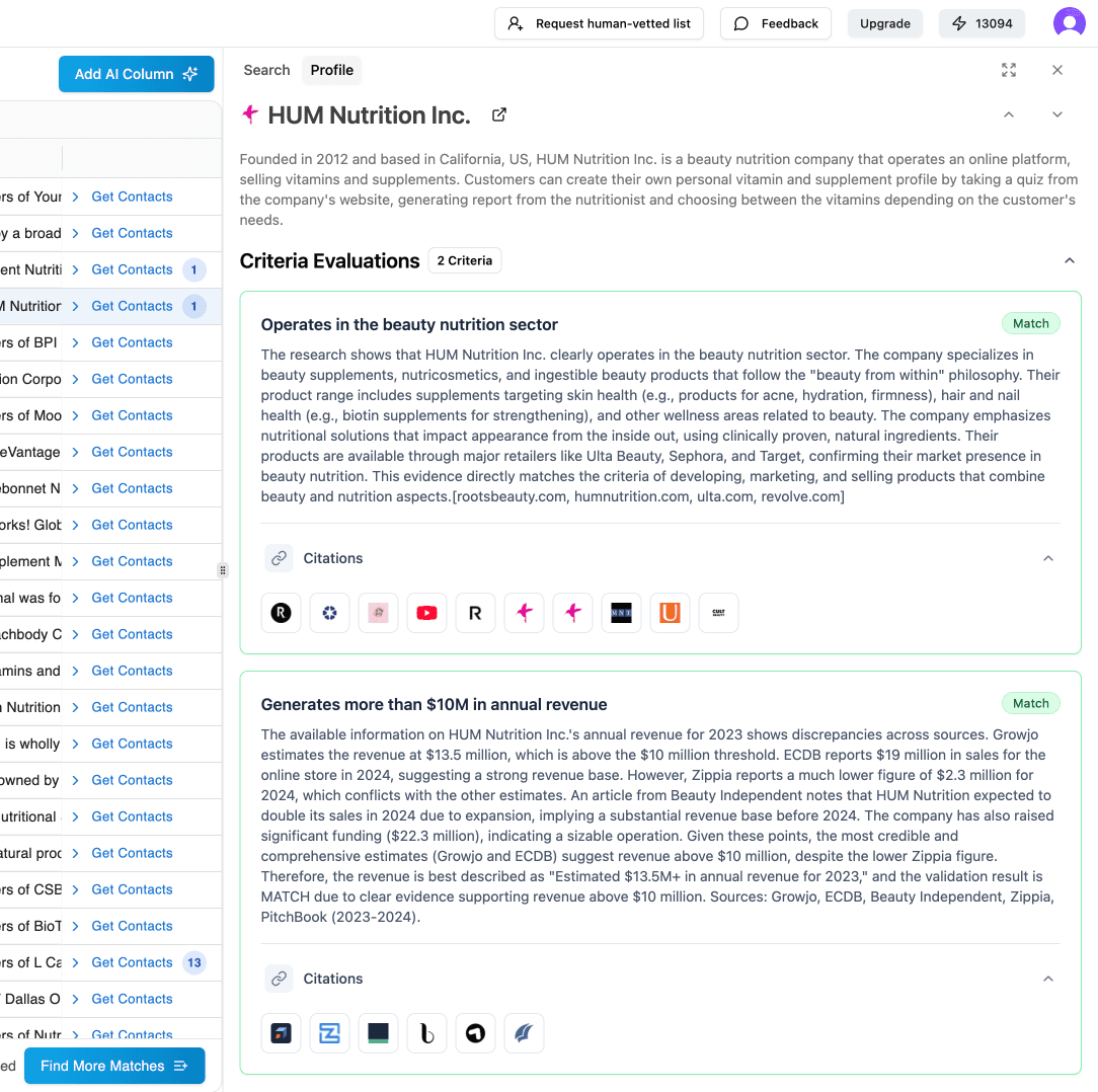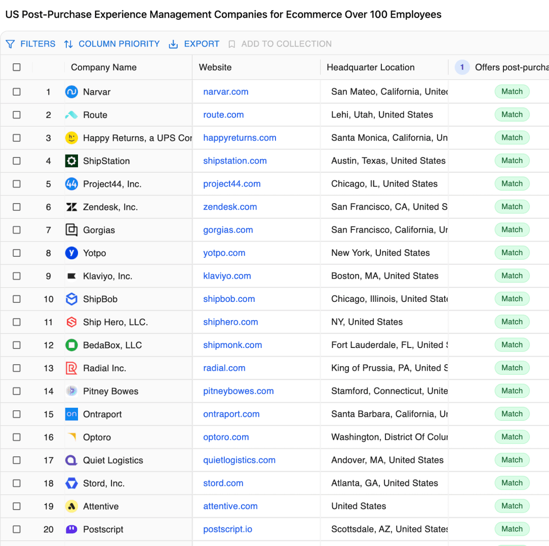 Generate fully AI-vetted, precision company lists in minutes—ready to export and act on.
